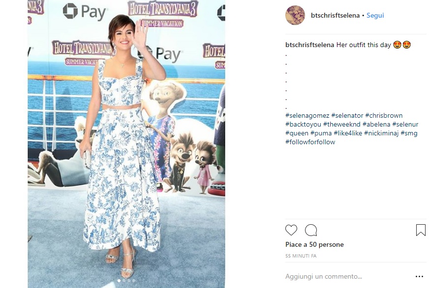 La cantante, alla première di Hotel Transylvania 3, ha scelto un abito della stessa collezione Oscar de la Renta. A differenza dell’abito di Meghan, però, il modello scelto da Selena era decisamente più smart, composta da due pezzi separati, un crop top e gonna lunga.