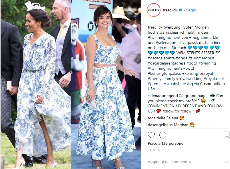 Stessa collezione Resort 2019 di Oscar de la Renta, stessa stampa ma due modelli opposti, uno decisamente più conservatore (quello di Meghan) e l’altro più pop (quello scelto da Selena Gomez). E voi quale preferite tra i due?