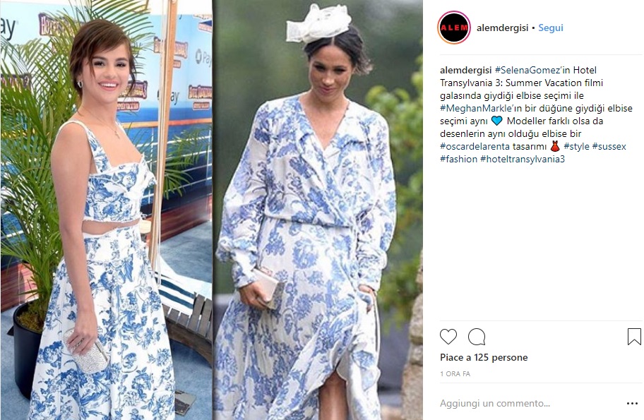 L’abito scelto da Selena Gomez in occasione della premiere del suo nuovo film Hotel Transylvania 3, infatti, assomiglia moltissimo a quello sfoggiato qualche settimana da Meghan Markle in occasione del matrimonio di Celia McCorquodale, cugina di Harry. Ricordate quel bellissimo abito blu e bianco con stampa floreale dal sapore retrò firmato Oscar de la Renta con cui Meghan ha catalizzato l’attenzione di pubblico e fotografi? Ebbene, recentemente Selena Gomez ha riproposto un look molto simile ma in versione più pop.