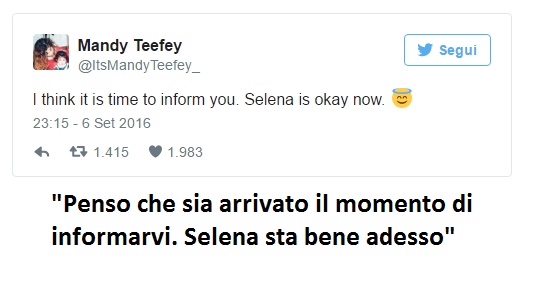 “Penso che sia arrivato il tempo per informarvi che Selena ora sta bene”.