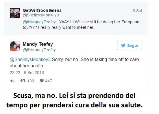 Ora, dopo molti rumors e gossip in merito alla condizione di salute di Selena, a parlare è proprio la mamma della cantante. Attraverso il profilo Twitter la madre, Mandy Teefey, chiarisce molte cose in merito alla salute della figlia e ai gossip che sono circolati in rete, come quello secondo cui Selena sarebbe finita in ospedale. Eppure, sembra che la cantante non sia mai stata ricoverata in ospedale nonostante la sua malattia sia molto pesante. A chiarire molti aspetti della condizione di salute di Selena ci ha pensato la mamma Mandy Teefey: