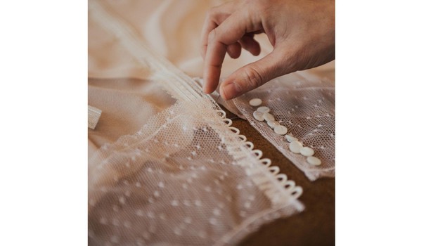 In un tenue color cipria, l’abito in chiffon di seta è arricchito da sovrapposizioni in pizzo vintage e da una profonda scollatura. Decorazioni floreali ricamate a mano e paillette colorate riprendono i particolari della collezione Coach Pre Fall 2017. Realizzate meticolosamente, queste articolate rifiniture impreziosiscono l’abito aggiungendo un tocco di vivacità ai dettagli femminili in pizzo.