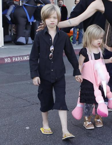 LOS ANGELES – Non è certo la prima volta che la piccola Shiloh, primogenita di Brad Pitt e Angelina Jolie, va in giro vestita come un maschietto. Ma in queste foto recentissime, in cui compare con i fratellini gemelli Vivienne e Knox, sembra proprio un maschio. Taglio di capelli come il padre, bermuda e camicia neri, infradito. Ma non sembra che sia la mamma a volerla vestire così: la piccola Vivienne, infatti, è vestita come una bambina. Pare che Shiloh abbia gusti precisi e ami, appunto, indossare abiti maschili. Tanto che mesi fa Angelina ha discusso con la suocera che aveva regalato alla bambina vestiti femminili per cercare di “correggere” quello che alcuni familiari, evidentemente, vivono come un’abitudine quantomeno bizzarra. (Foto Lapresse).