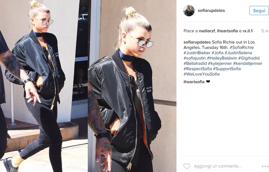 Dopo il ciclone mediatico che ha visto come protagonisti lei, Justin Bieber e Selena Gomez, Sofia è stata paparazzata per le vie di Los Angeles e le foto in cui appariva serena e sorridente in compagnia del nuovo fidanzato sembrano un lontano ricordo. Come scrive il Daily Mail, Sofia appare triste e cupa, incredibilmente sola e vestita di nero: colore che più di tutti sottolinea uno stato d’animo non proprio allegro. Certo, lo stile alla sorella di Nicole Richie non manca: nonostante il trambusto delle ore scorse appare incredibilmente glamour con dei jeans skinny neri, bomber e capelli biondissimi tirati su in uno stilosissimo bun. La ragazza è stata pizzicata mentre si trovava da sola per le vie di Los Angeles intenta ad andare a prendere un caffè, probabilmente per cercare di stemperare il clima difficile dei scorsi giorni.