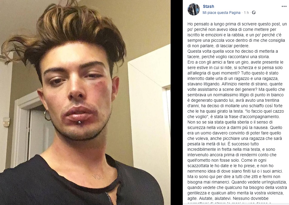 MILANO – Stash difende una donna e viene picchiato: la denuncia in una FOTO su Facebook. Volto livido con segni di percosse: Stash pubblica una drammatica foto-denuncia sul suo profilo Facebook. Secondo la ricostruzione del cantante, Stash si trovava in giro con degli amici quando ha sentito un ragazzo e una ragazza litigare. Sembrava una discussione come tante quando il ragazzo, circa 30 anni, ha dato un forte schiaffo alla ragazza. A quel punto Stash ha deciso di intervenire per difendere la donna ed è stato protagonista di una scazzottata. Di seguito il post del cantante: