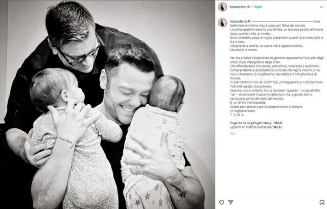 La coppia ha due figli, Margherita e Andres, nati nel febbraio 2022. Tiziano ha spiegato che al momento i bambini trascorrono la maggior parte del tempo con lui e che la sua priorità è la loro tutela. Ha anche annunciato che non potrà onorare gli appuntamenti in Italia per presentare il suo romanzo, poiché non può lasciare i figli e portarli con sé.