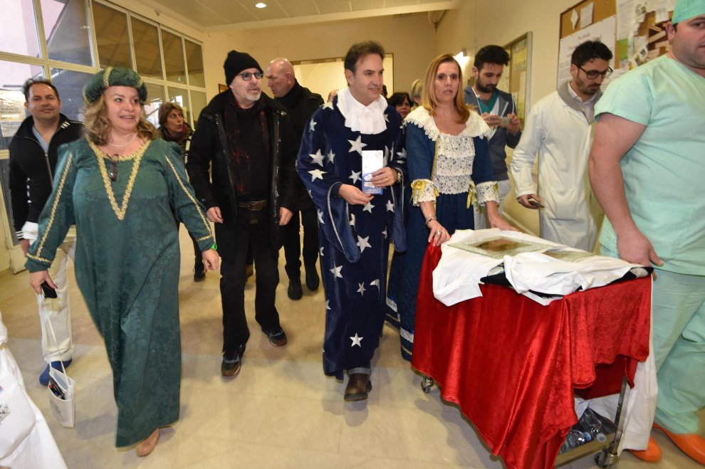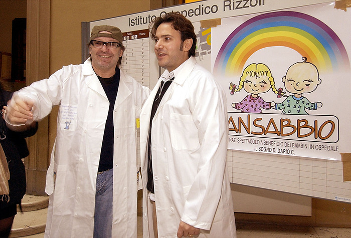 VASCO ROSSI AL RIZZOLI DI BOLOGNA COME 'MEDICO DEL SORRISO'. Vasco Rossi in camice bianco all'istituto ortopedico Rizzoli di Bologna per una visita organizzata dall'Ansabbio,l'associazione di beneficenza che porta gli artisti ad esibirsi all'interno delle strutture ospedaliere per alleviare le sofferenze dei piccoli degenti.A dx Dario Cirrone responsabile dell'associazione. NUCCI/BENVENUTI/ANSAVasco Rossi all'ospedale