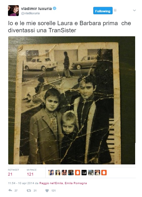 Nonostante ciò, Luxuria all’anagrafe risulta appartenente al genere maschile, come in accordo con la legge 164/1982 che prevede la rettificazione di attribuzione di sesso “diverso da quello enunciato nell’atto di nascita” solo (a meno che il medico non lo ritenga necessario) a seguito di intervenute modificazioni dei suoi caratteri sessuali primari. Ma siete curiosi di sapere com’era Vladimir Luxuria da giovane? Recentemente la conduttrice ha pubblicato su Twitter una foto in cui era ancora un bambino. Uno scatto in bianco e nero in cui appare insieme alle sorelle Barbara e Laura. Ironica la frase postata da Luxuria: