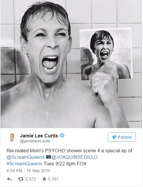 ROMA – Jamie Lee Curtis imita la madre postando su Twitter una foto in cui riproduce la scena del famoso urlo di Janet Leigh nel film ”Psycho” del 1960, diretto dal maestro del brivido Alfred Hitchcock. “Ho ricreato la scena della mamma nella doccia per uno speciale episodio di Scream Queens”, spiega la Curtis riferendosi al programma della rete televisiva Fox