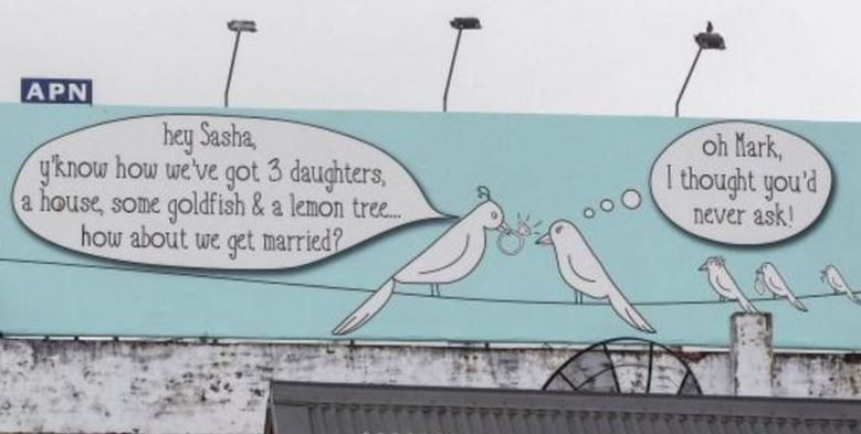 NUOVA ZELANDA – Chiede alla sua compagna di sposarlo attraverso un simpatico cartellone pubblicitario. Secondo quanto riportato da Cosmopolitan, Mark, questo il nome dell’uomo di origine neozelandese, ha scelto l’immagine di due uccelli che si guardano l’un l’altro.