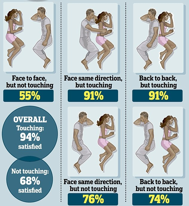 “Il novantaquattro per cento delle coppie che hanno trascorso la notte in contatto tra loro erano felici della loro relazione, rispetto ad appena il 68 per cento di quelli che non hanno dormito vicini. Questa è la prima indagine fatta per esaminare le coppie in base alle posizioni che assumono durante il sonno, ed i risultati permetteranno alle persone di farsi un’idea sulla loro vita affettiva”.
