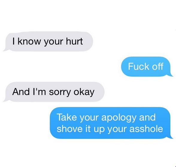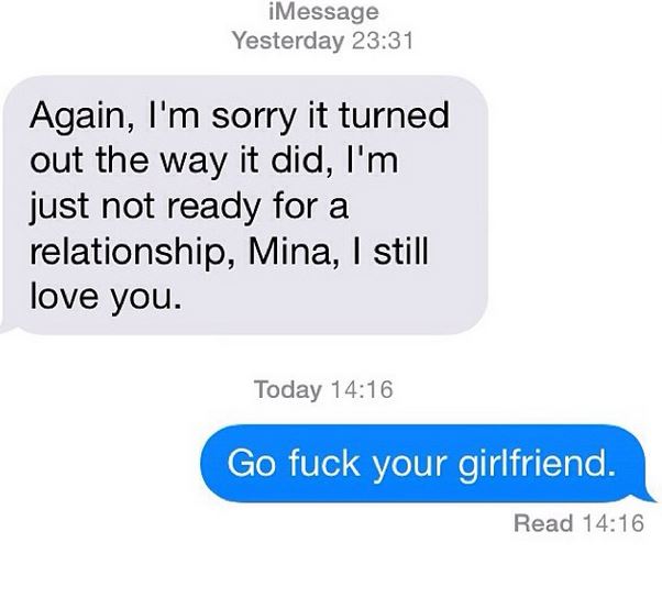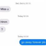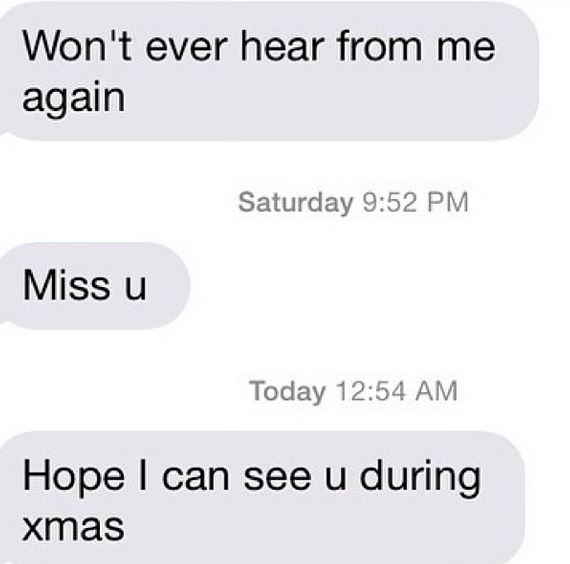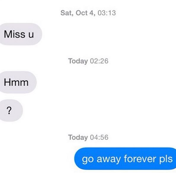 “Non volevo farti soffrire” o “Non posso vivere senza di te”, messaggi ai quali spesso però seguono risposte non proprio amorevoli come “Fu** YOU!”, “NON SCRIVERMI PIU’” o “Ho cancellato il tuo numero, ciao”. Per inviare il proprio contributo è sufficiente inviare il proprio sceenshot alla mail textsfromyourex@gmail.com., che però al momento pubblica solo quelli scritti in inglese.
