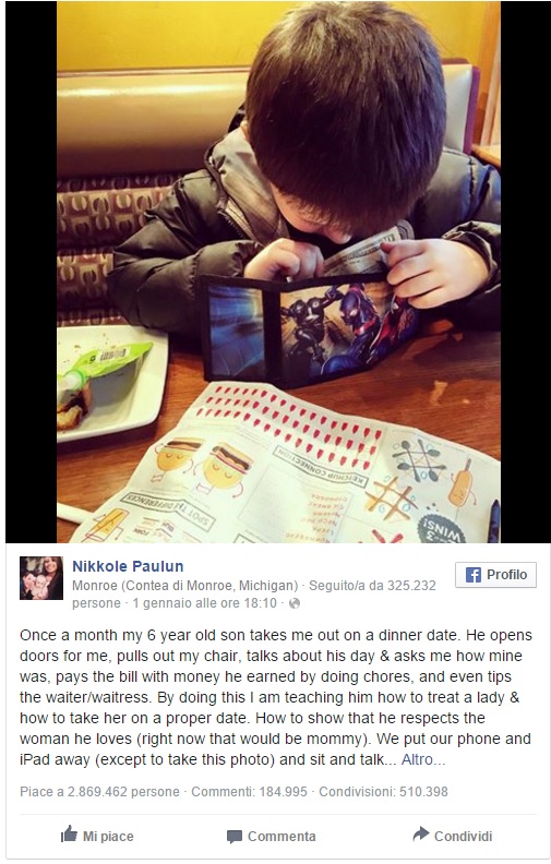 Nikkole ha pubblicato la foto di suo figlio che apre il proprio portafogli e paga il conto al ristorante: “Andiamo a cena fuori una volta al mese, – scrive la donna nel post che accompagna la foto – ed è mio figlio a pagare il conto con i soldi che guadagna facendo dei lavoretti. Lui mi apre anche la portiera dell’auto e mi sistema con cura la sedia. Mi chiede anche com’è andata la giornata, e lo faccio perché impari a rispettare le donne e a saperle amare (per adesso ci sono solo io, ma in futuro?)”.