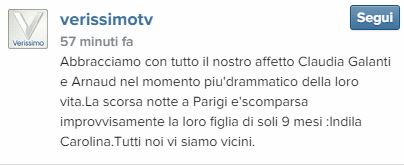 “Abbracciamo con tutto il nostro affetto Claudia Galanti e Arnaud nel momento piu’drammatico della loro vita.La scorsa notte a Parigi è scomparsa improvvisamente la loro figlia di soli 9 mesi: Indila Carolina. Tutti noi vi siamo vicini.”