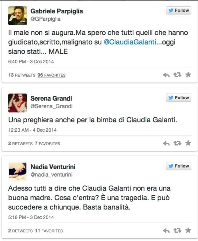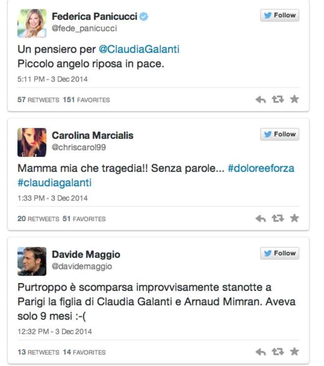 Un dolore grande, quello che nessun genitore vorrebbe mai provare. Centinaia i messaggi di condoglianze in risposta allo scatto di lutto. Non sono mancati i messaggi di vip come Serena Grandi, Nadia Venturini, dalla stessa Federica Panicucci, Davide Maggio e Carolina Marcialis, moglie di Antonio Cassano, tutti vicini al dramma della show girl paraguaiana e dell’imprenditore francese.