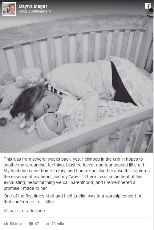 ROMA – Una mamma del Michigan si addormenta nella culla insieme alla sua bambina di cinque mesi. La foto finisce su Facebook e scioglie i cuori di migliaia di persone in tutto il mondo. La donna della foto è Dayna Mager: nello spiegare la foto condivisa più di 23mila volte, Dayna ha voluto raccontare un’esperienza vissuta. Il post è stato tradotto in diverse lingue: