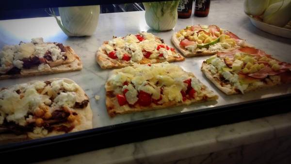 Per la pausa pranzo ovviamente la fa da padrona la gastronomia “da banco”, veloce ma assolutamente gourmet: tramezzini, panini, pinse e bagel. Consiglio di provare il tramezzino trota, ciliegie, formaggio di capra e cipolla caramellata davvero godurioso, la sfiziosissima pinsa avocado, speck e provola o il bagel con roast beef e salsa tonnata.