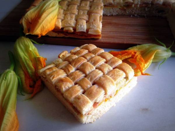 A questo punto prendete la teglia delle dimensioni di 30×40 cm, oleate e stendete la pasta della pizza, sopra adagiate le fette di prosciutto cotto poi quelle di provola e i fiori di zucca.