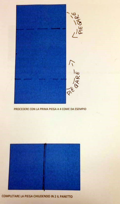 Bisogna dare la prima piega a quattro portando i due lati (superiore ed inferiore) verso il centro e ripiegando a mo’ di libro.