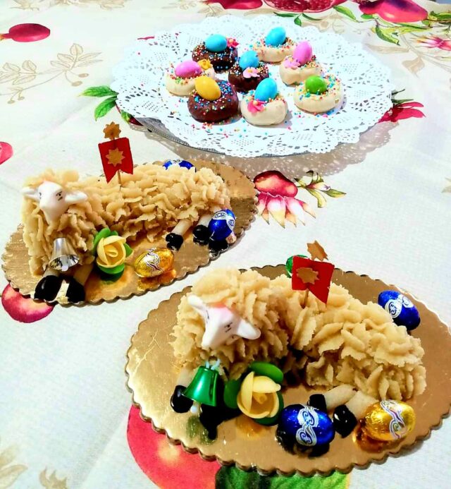 Sbattete a lungo i rossi dell’uovo con lo zucchero e metteteli in cottura a bagnomaria in una casseruola mescolando fino ad ottenere un composto consistente. Con faldacchiera, marmellata di pere e pezzetti di cioccolato farcite il tutto. Prendete l’altra parte di pasta di mandorle e ricoprite, poi capovolgete su vassoi in cartone usa e getta o cestini in legno. In seguito decorate a piacimento con della pasta di mandorle stemperata con albume d’uovo e con l’aiuto di una siringa da pasticciere. Il volto dell’agnello dovrete modellarlo armati di buona pazienza, potete aggiungervi confettini argentati e nastri.