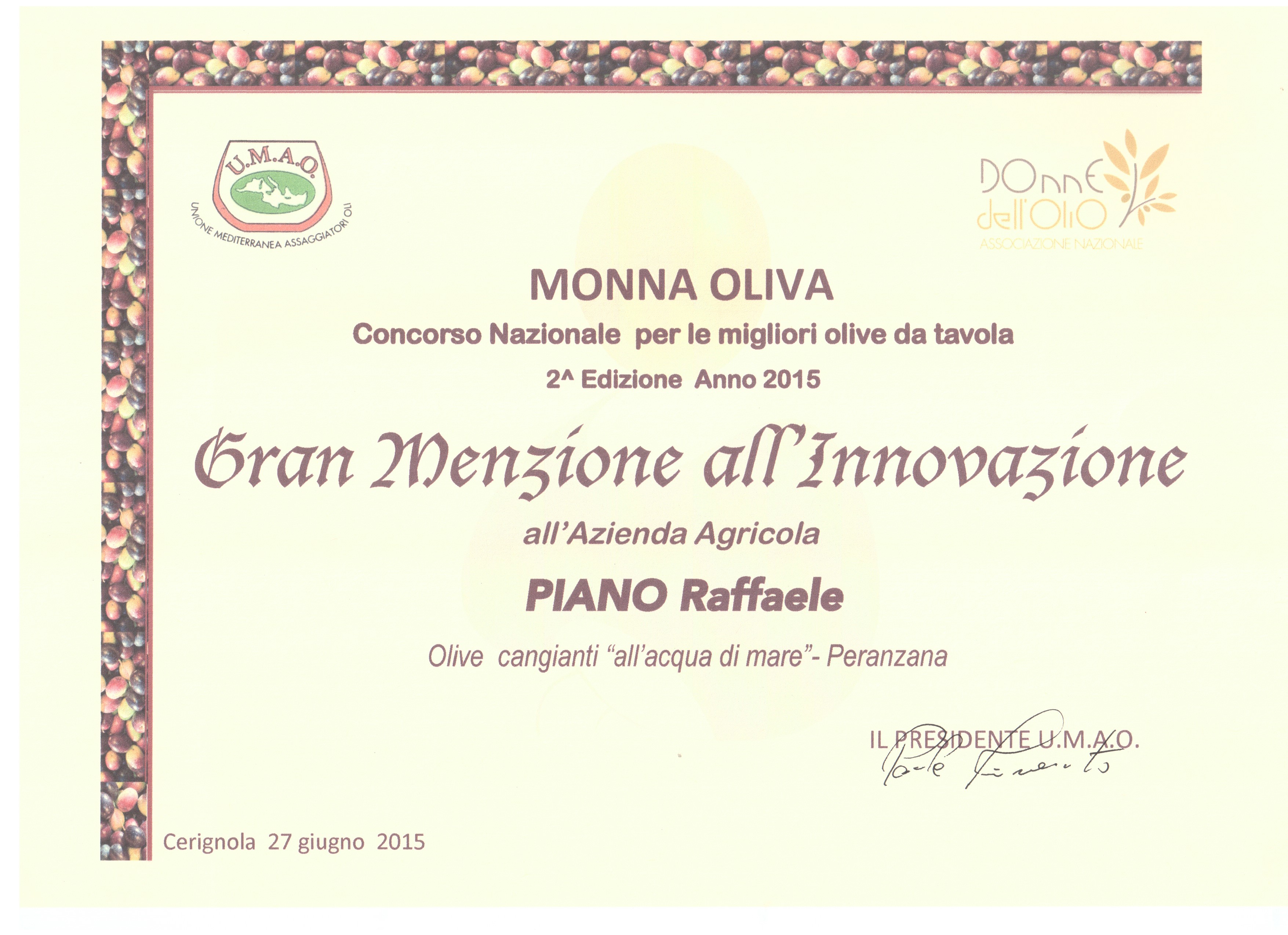 Attualmente, nell’Agricola Piano, si coltiva, si produce, si conserva: Olio Extravergine di Oliva da Monocultivar Peranzana, pluripremiato tra i migliori in Italia; Olive Peranzana in Acqua di Mare, unica azienda al mondo a produrle con questo metodo arcaico e sono per questo vincitrice di un premio;