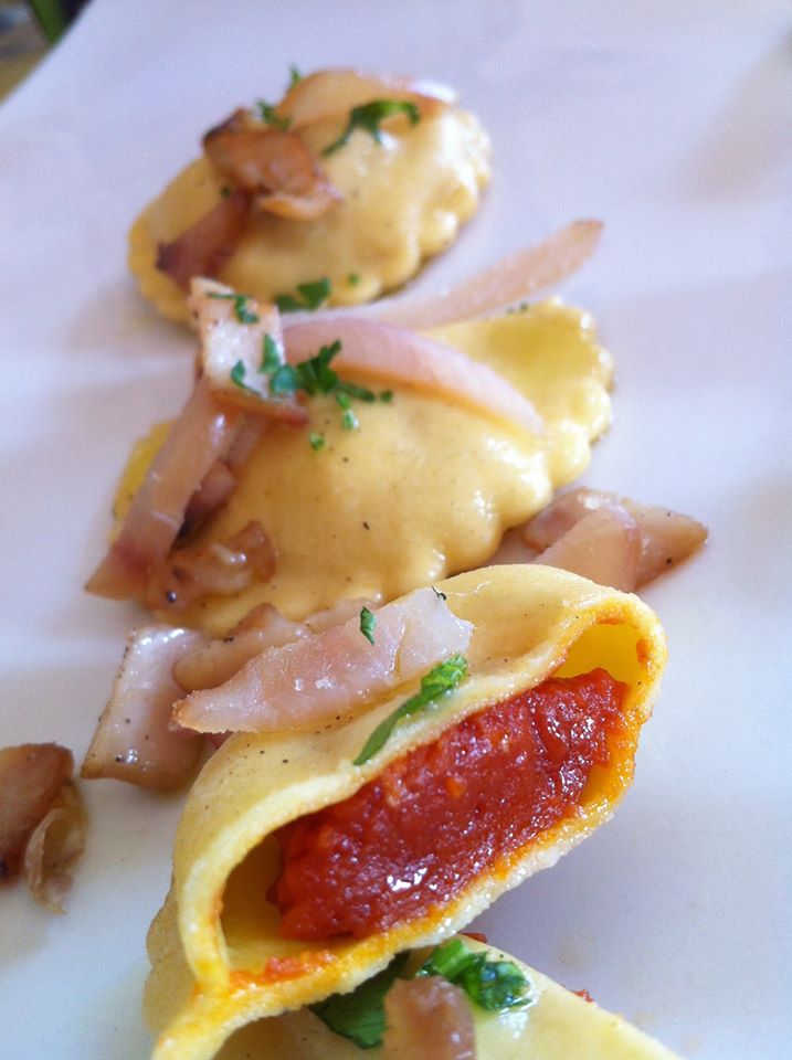 In una pentola, mettere abbondante acqua, salarla e quando raggiunge il bollore versare i ravioli, dopo 3-4 min, con una schiumarola adagiare i ravioli nella padella con il soffritto. Aggiungere un pò di acqua di cottura quando serve e terminare la cottura a fiamma viva, facendo attenzione a non rompere i ravioli e lasciando un pò di cremina sul fondo. A cottura ultimata, spegnere il fuoco, aggiungere il resto della lampuga, spolverare con un po di pepe e prezzemolo, servire il tutto con ciuffi di sugo e crema di pecorino.
