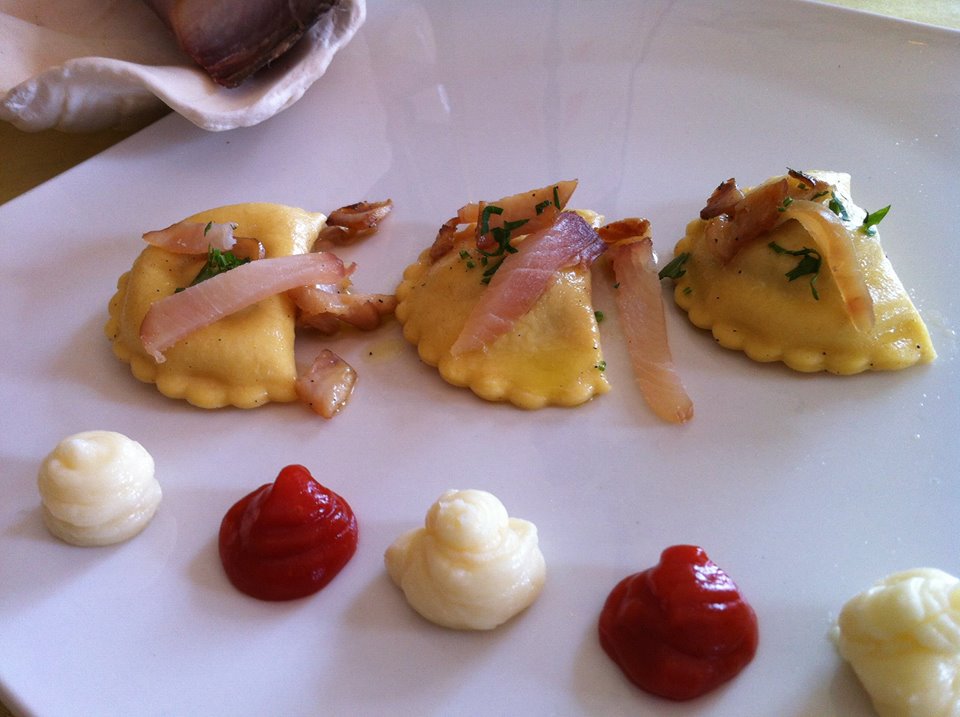 Stendere la pasta in una sfoglia sottile ( n. 8 della sfogliatrice ken.) e con l’ aiuto di una sac à poche, fare tanti mucchietti di sugo distanziati l’uno dall’altro 3 cm. circa. Piegare la sfoglia su se stessa e con un coppapasta ritagliare delle mezze lune.