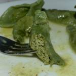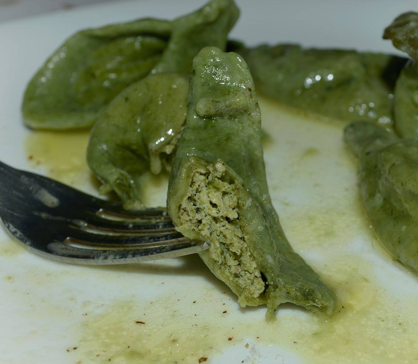 La pasta per realizzare questi grossi tortelli è di colore verde, viene preparata con l’aggiunta di spinaci che sostituiscono in parte le uova.