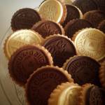Con la cartaforno formare un cono e versare un po di cioccolata bianca all’interno, mettere un puntino di cioccolato al centro del biscotto, attaccarvi sopra il medaglione di cioccolata e continuare con il resto.