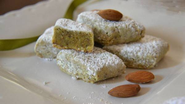 In una ciotola ponete la farina di mandorle, il pistacchio tritato, lo zucchero a velo e l’albume.