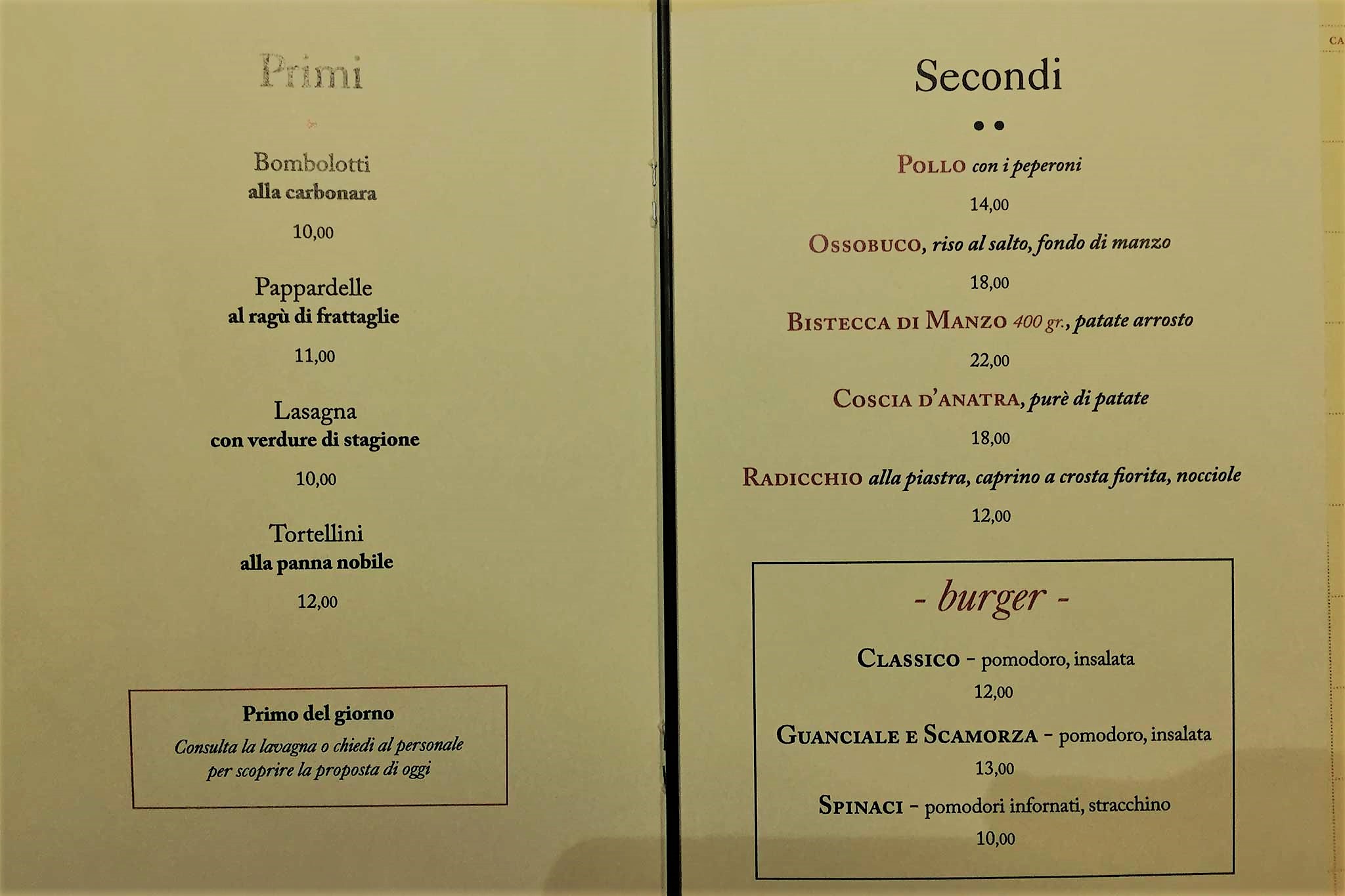 Sui secondi spiccano per golosità il pollo con i peperoni, la coscia d’anatra con purè di papate, la bistecca di manzo con patate al forno o l’ossobuco e riso al salto.