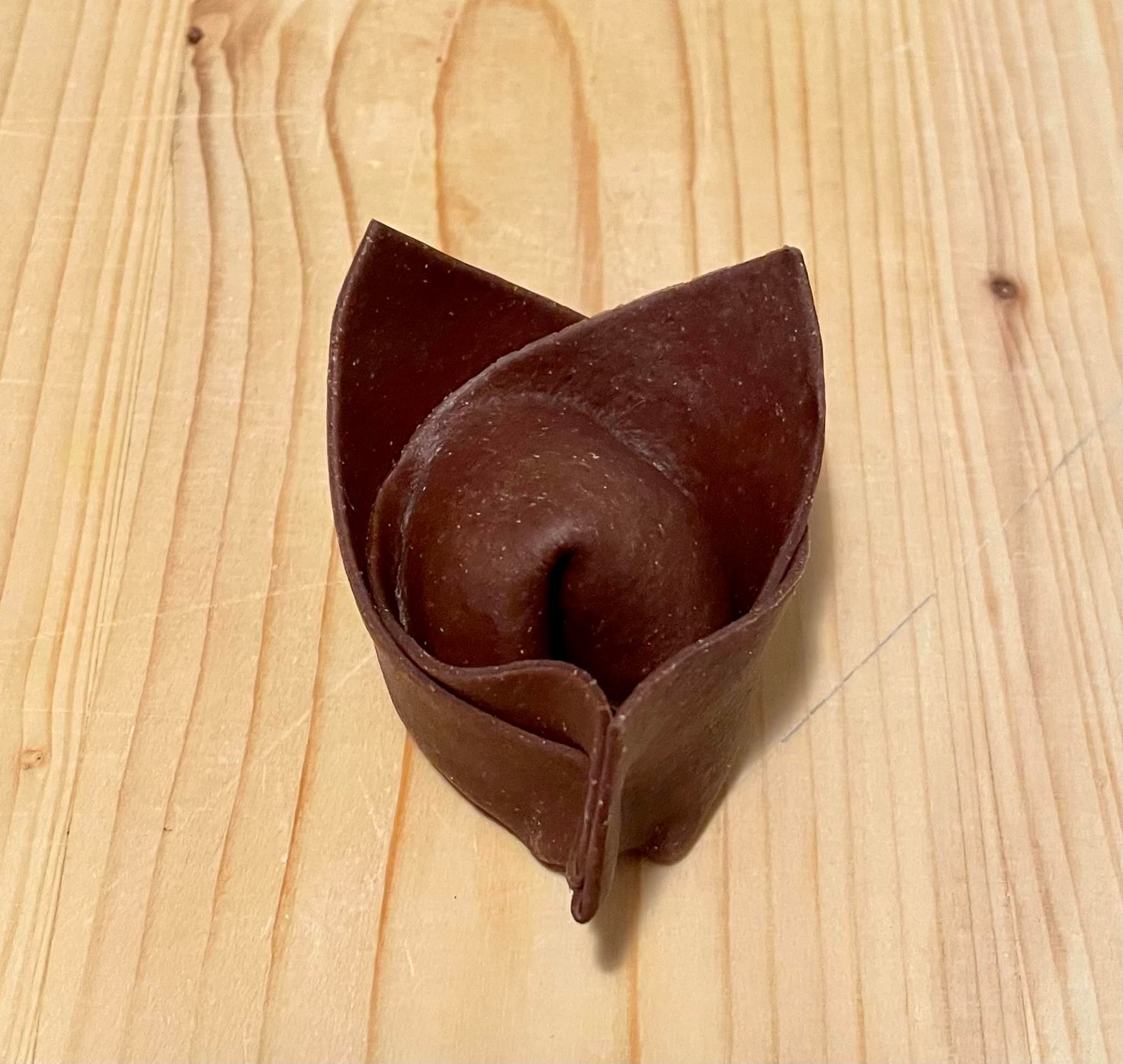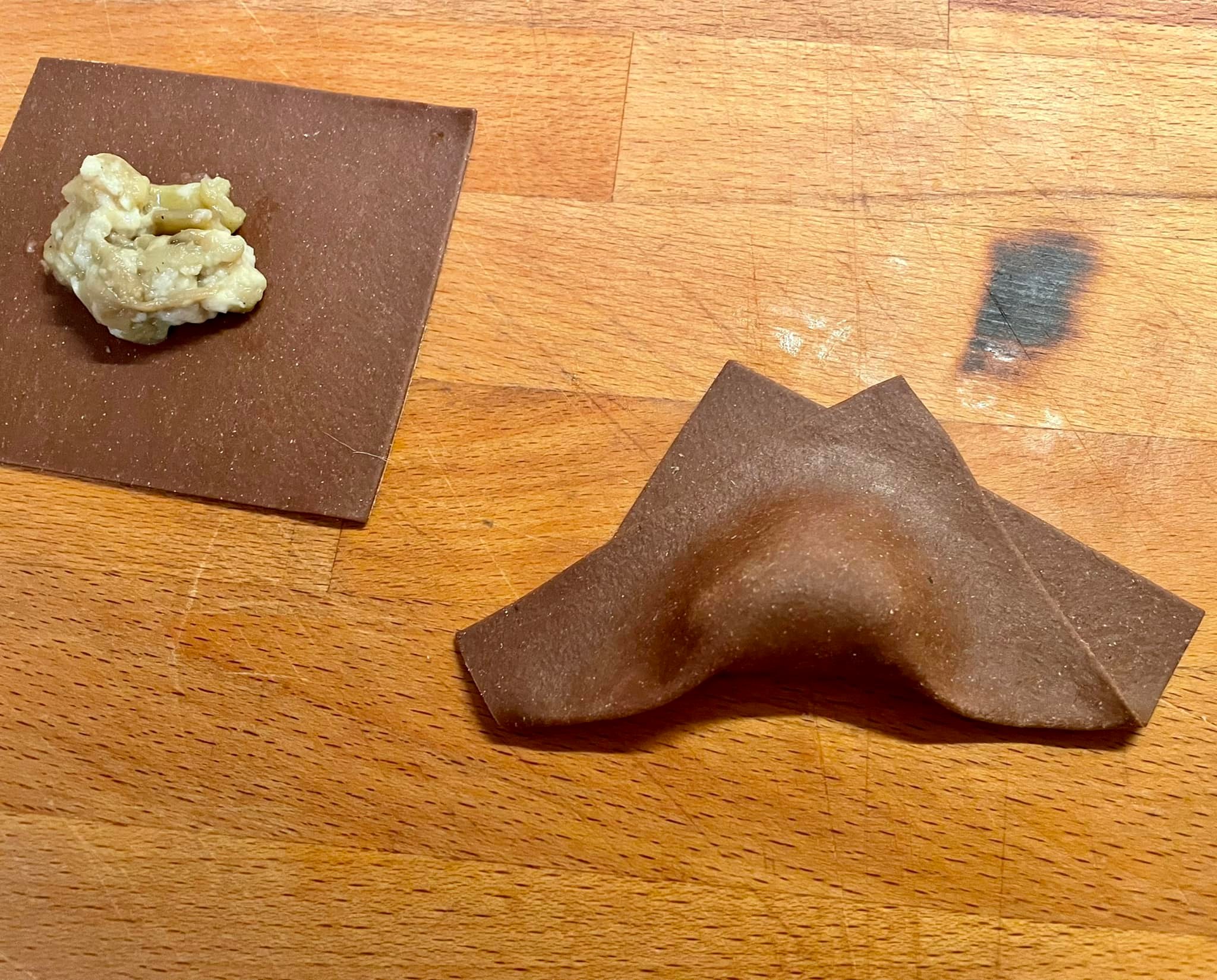 La scoperta del “cioccolato dolce” avverrà anni dopo, per merito delle suore di Oaxaca in Messico, che vi aggiunsero miele, cannella e zucchero di canna. Ciò però non vuol dire che la “vocazione” del cacao per i cibi salati sia scomparsa, anzi sono molte le ricette che vedono l’uso del cacao in preparazioni salate e tra queste c’è anche la pasta, come questi deliziosi Cappellacci al Cacao ripieni di Melanzane che ci propone Andrea Appre De Re.