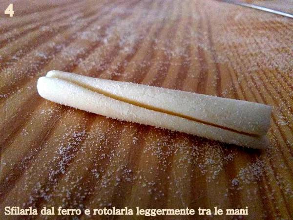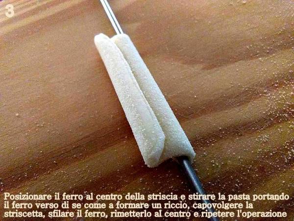 Prendere un rettangolo di pasta, al centro posizionare il ferro e stirare la pasta portando il ferro verso di se come a formare un riccio, capovolgerlo, sfilare il ferro, rimetterlo al centro e ripetere l’operazione, bisogna ottenere una S.