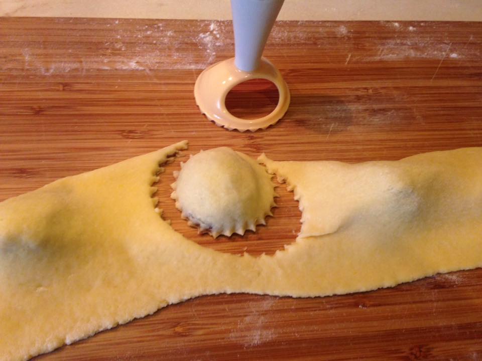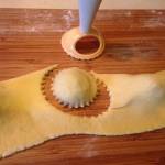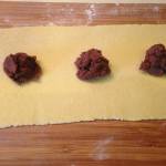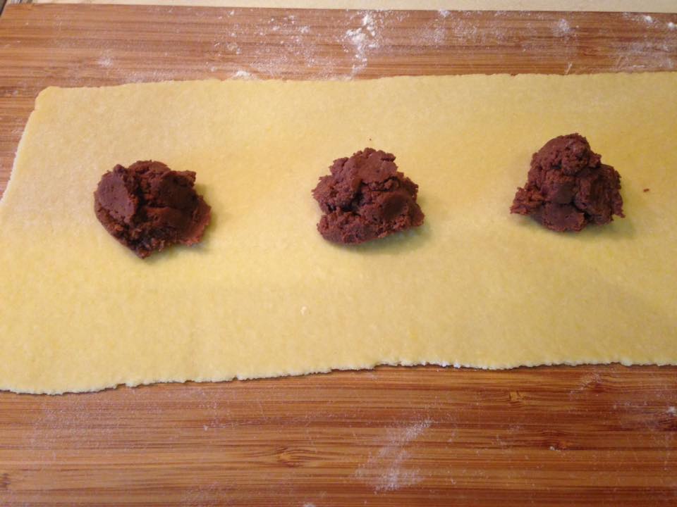 Riprendete la pasta frolla, tirate una striscia d’impasto sottile e, con un cucchiaio, cominciate a posizionare il ripieno al centro, un po’ distanziato. Ripiegate la sfoglia su se stessa e, con uno stampo per ravioli, ritagliate e sigillate il ripieno al loro interno.