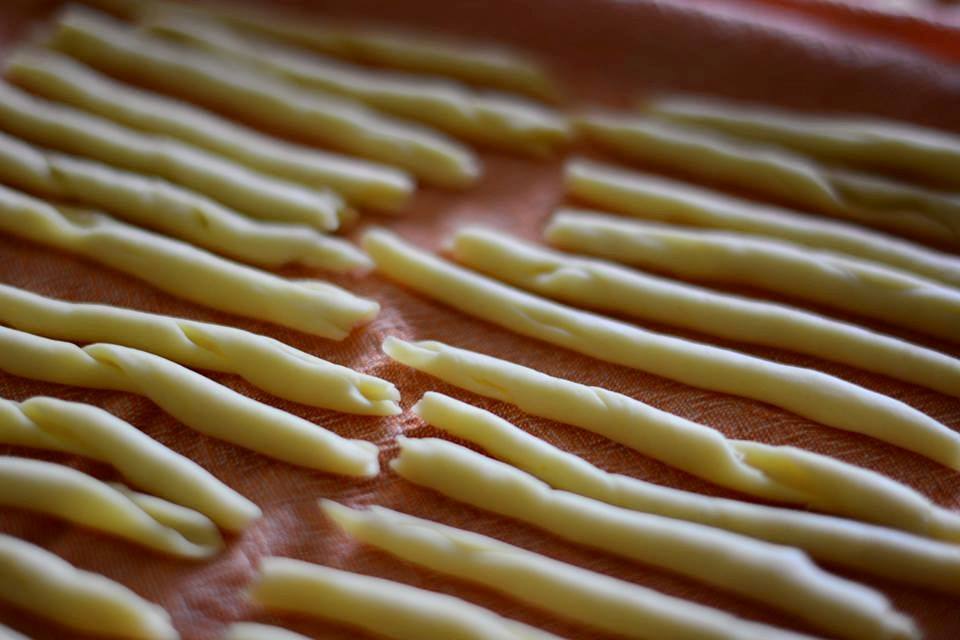 Questa ricetta rappresenta in sintesi la Basilicata, perché prevede l’impiego di tre elementi fondamentali della cucina tradizionale di questa regione: i cavatelli fatti in casa, a base di acqua e farina di grano duro; il baccalà, uno dei pochi pesci che faceva parte dell’alimentazione lucana, grazie alla possibilità di essere conservato a lungo in salamoia e quindi trasportato in luoghi distanti dal mare; e i peperoni cruschi, ovvero peperoni lasciati a essiccare ai raggi del sole in lunghe ‘nserte, vere e proprie collane in cui i peperoni vengono cuciti e legati tra loro.
