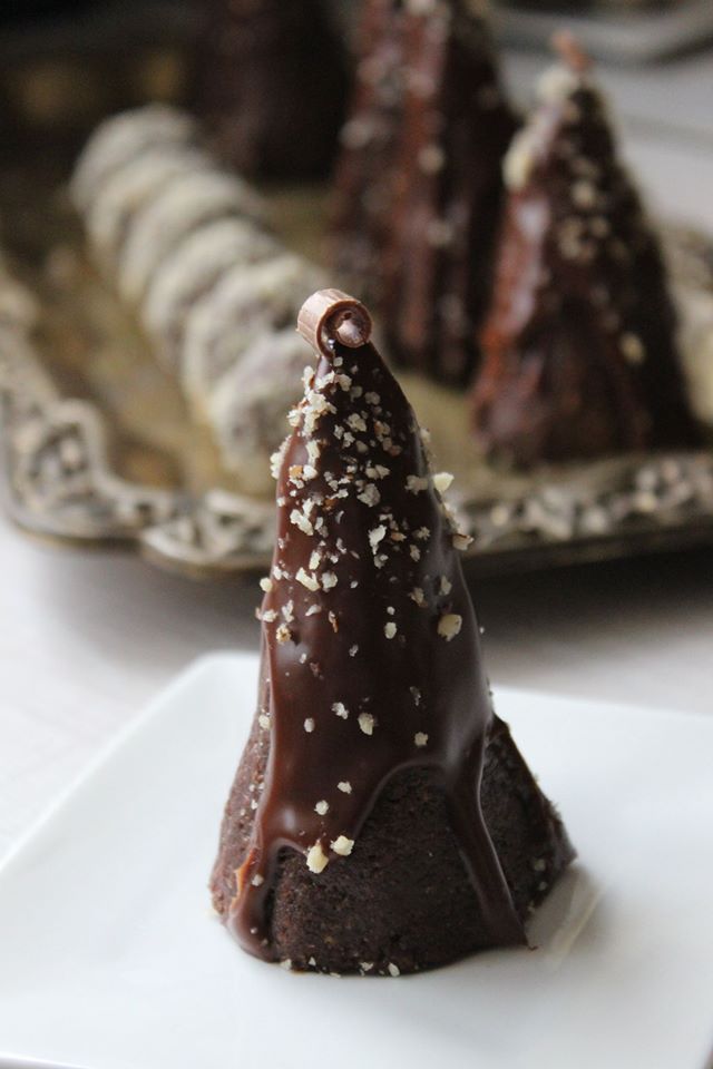 Preparare con il cioccolato e la panna la ganache per la decorazione e versare una cucchiaiata abbondante su ogni cono quindi decorare con noci tritate e scaglie di cioccolato.
