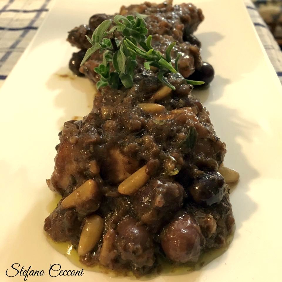 Aggiungere le olive taggiasche e i pinoli; (a questo punto della cottura, se piacciono, aggiungere fegato e rognoni).