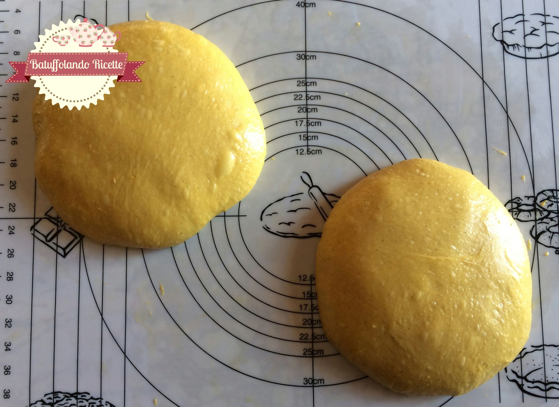 Rovesciare l’impasto su un piano da lavoro (io di silicone che è l’ideale) abbondantemente imburrato, imburrarsi anche le mani, dividere cun un tarocco l’impasto e pesarlo su un piatto largo coperto da carta da forno, deve essere precisamente la metà! Se non lo è prelevare il pezzetto che occorre dalla pezzatura più grande ed unirla a quella più piccola; poi fare la prima pirlatura arrotondando la pezzatura d’impasto e trascinandolo verso di sè, arrotondarlo di nuovo e coprirlo con una ciotola. Fare la stessa cosa con la seconda pezzatura.