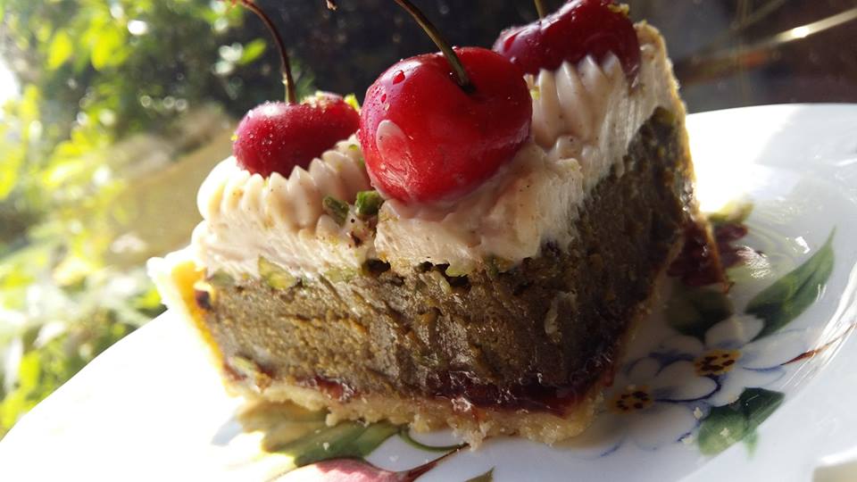 Un vero dolce d’autore, una crostata moderna del maestro Leonardo Di Carlo, una friabile frolla ripiena di confettura di ciliegie e morbida crema al pistacchio, sormontata da un soffice cremoso alla vaniglia e decorata da granella di pistacchi e ciliegie fresche.