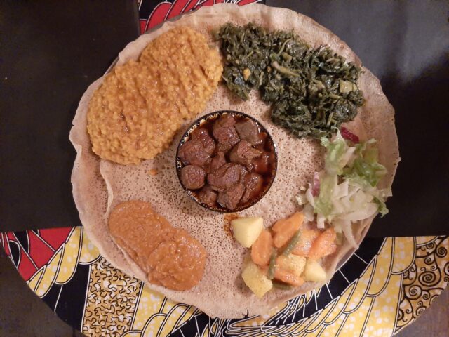 Un piatto misto del ristorante Eritrea a Roma con sambusa, kategna, falafel