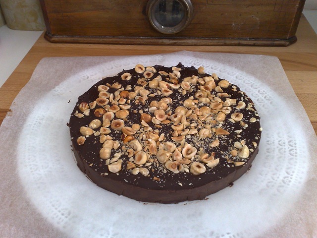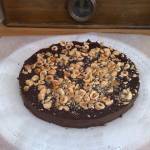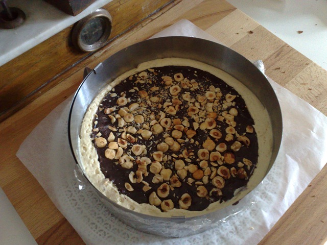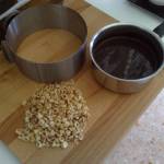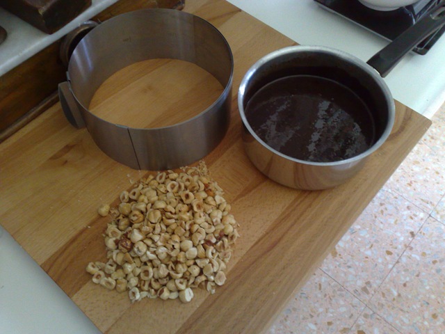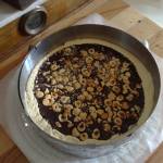 Cominciamo a preparare subito la ganache che per una parte andrà all’interno della torta e l’altra per poi decorare alla fine. Facciamo bollire la panna e ci versiamo il cioccolato tagliato a pezzetti e giriamo con la frusta. Mescolato per bene lo versiamo in un anello da 20 cm (quindi 2 cm più piccolo dello stampo della torta) e ci versiamo sopra le nocciole tostate tagliate grossolanamente e poi mettiamo in congelatore …