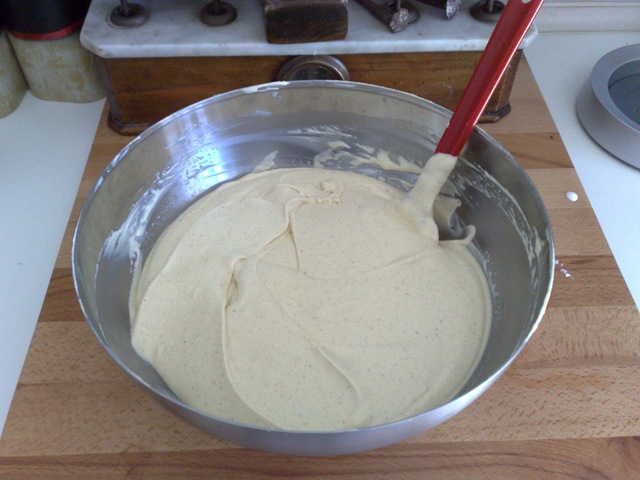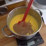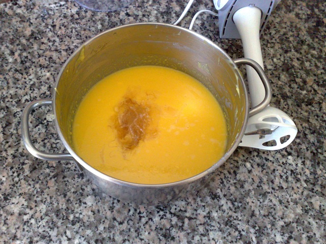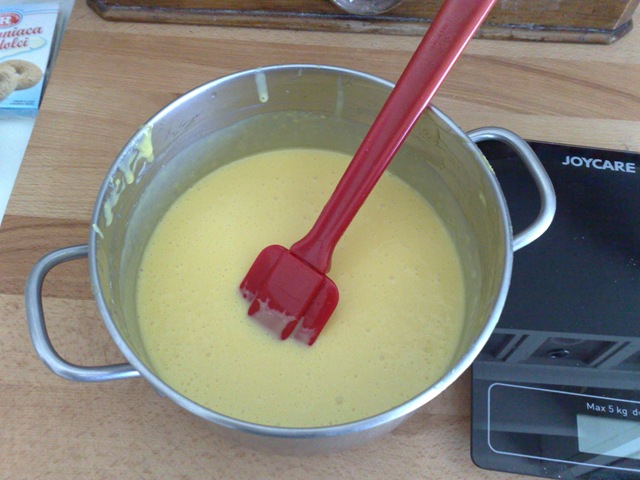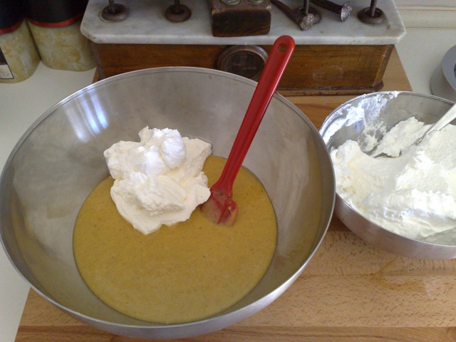 … incorporiamo ora la panna montata mettendone una prima parte mescolando energicamente e poi la restante parte girando dal basso verso l’alto per non smontare la bavarese …
