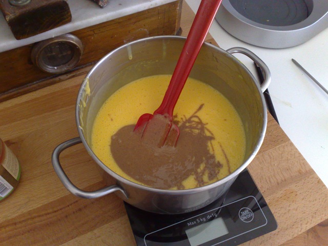 …ora prepariamo la bavarese alla nocciola. Portiamo a bollore il latte e nel frattempo sbattiamo i tuorli con lo zucchero. Versiamo il latte sopra i tuorli e rimettiamo sul fuoco portando a 85°C (come per la crema inglese) girando con la frusta. Togliamo dal fuoco e versiamo immediatamente (per abbassare subito la temperatura) il cioccolato bianco tagliato a pezzetti e la colla di pesce ammorbidita in acqua fredda ed emulsioniamo con frullatore ad immersione. Per ultimo inseriamo la pasta di nocciole…