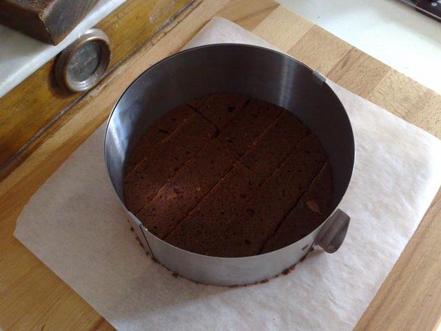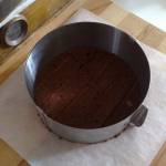 Cominciamo a montare il dolce prendendo il pan di spagna al cioccolato tagliato a fettine di un paio di cm e mettendole una di fianco all’altra per poi ricavarne un cerchio della stessa misura del disco di ganache al cioccolato…
