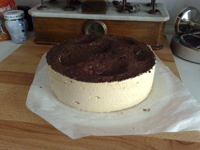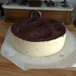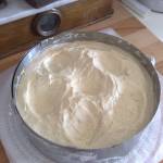 …lo mettiamo al centro dell’anello da 22 cm lasciando quindi uno spazio di 1 cm tutto intorno. Mettiamo la bavarese in un sac a poche e cominciamo a fare un primo strato coprendo il pan di spagna e facendo attenzione a farne colare nello spazio lasciato tutto intorno e poi ci mettiamo il disco di ganache sopra al centro…