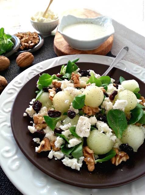 La feta salata e saporita è il contraltare perfetto per le dolcissime e succose perle di melone bianco e la deliziosa uva passa. Le noci regalano croccantezza e forniscono una dose importante di vitamine e nutrienti, la valeriana aggiunge colore e armonizza tutti i sapori con la sua delicata presenza.