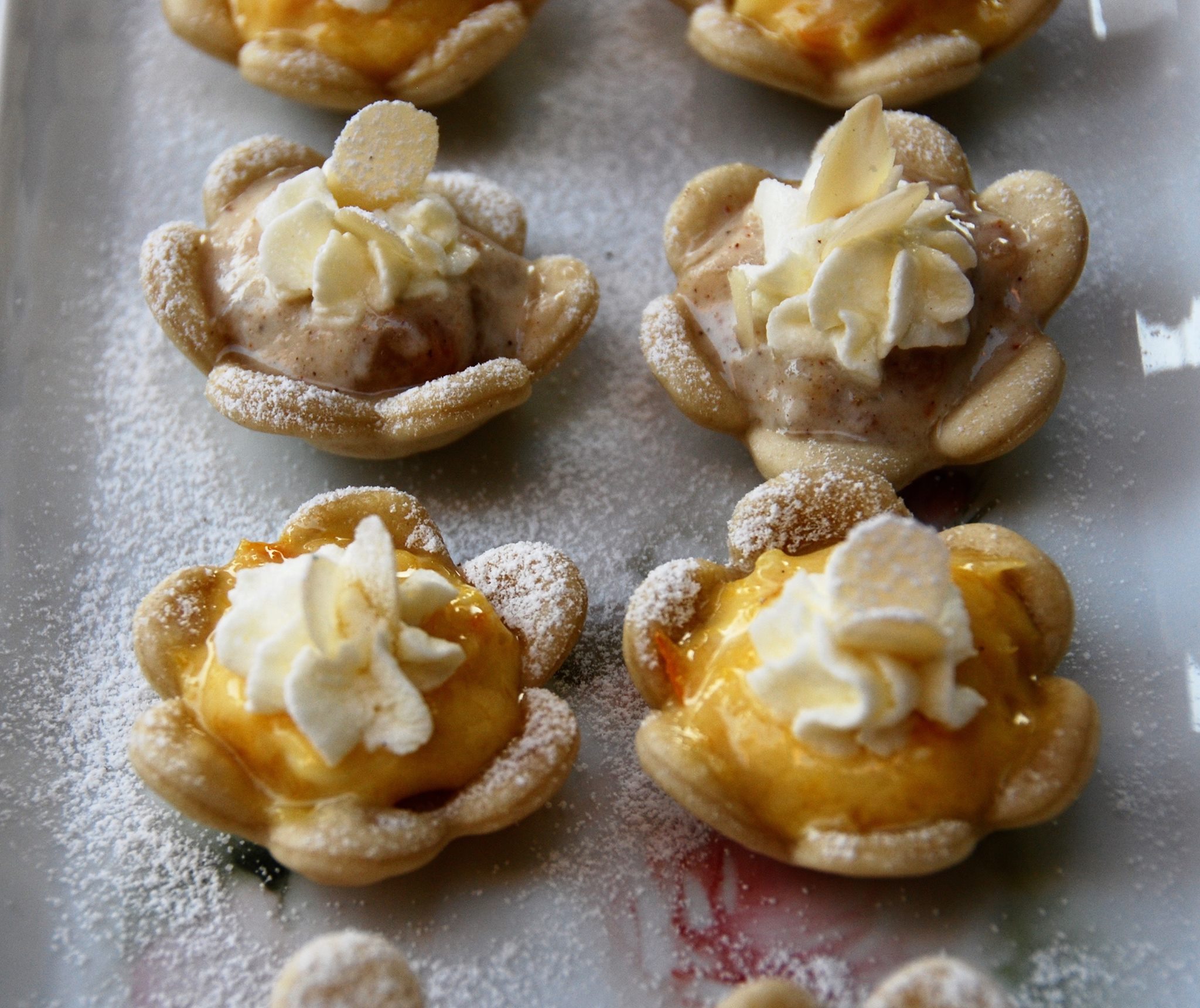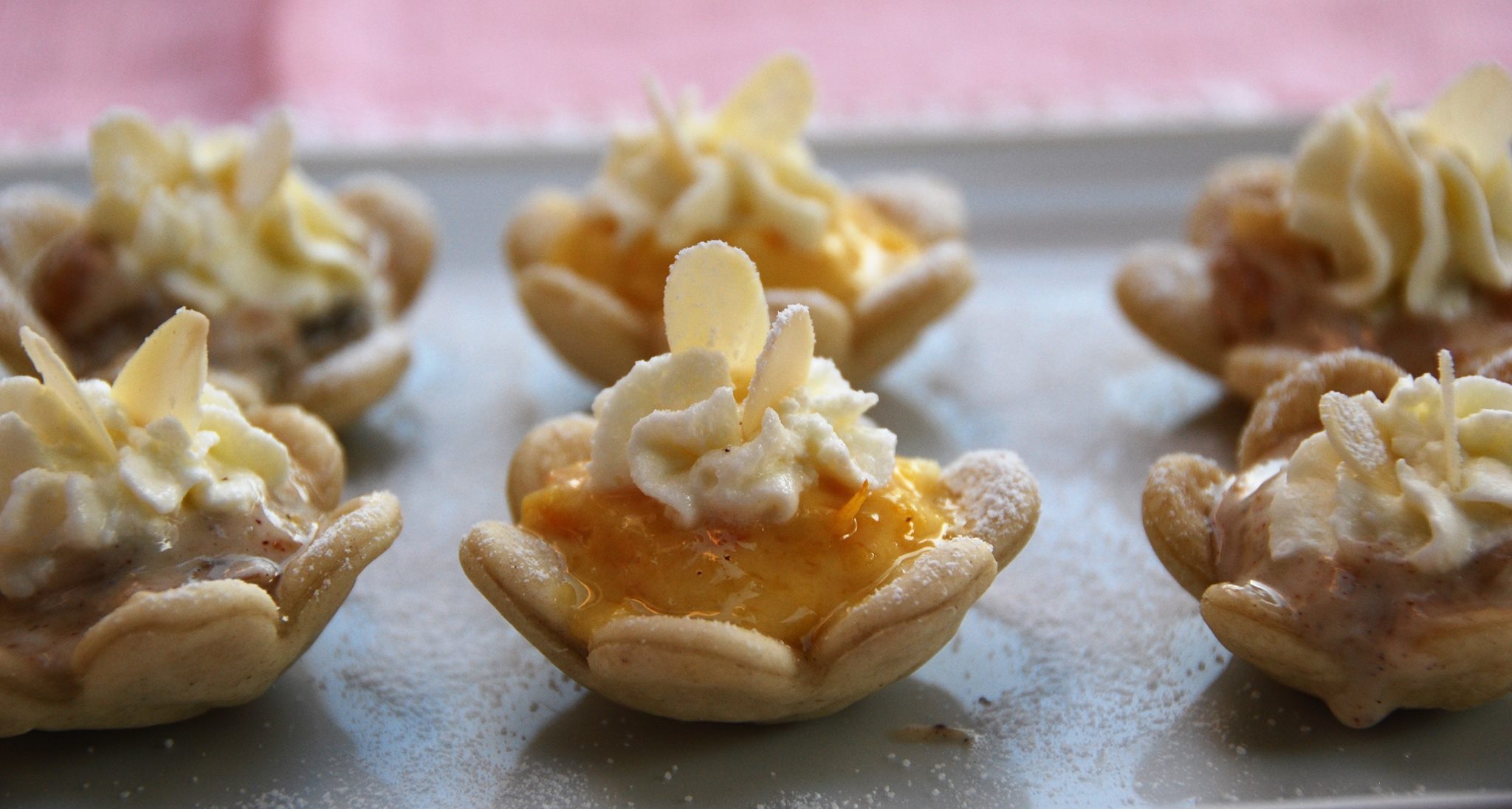 Inserire in ogni fiorellino un cucchiaino di ripieno, guarnire con della crema chantilly o della semplice panna montata che avrete messo in un sac a poche, due o tre lamelle di mandorle e una spruzzata di zucchero a velo.