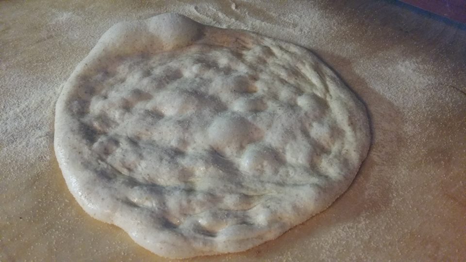 Spolverare abbondantemente la spianatoia di semola e stendere le focaccine delicatamente senza rompere le bolle d’aria, condire con un giro d’olio e poco sale.