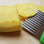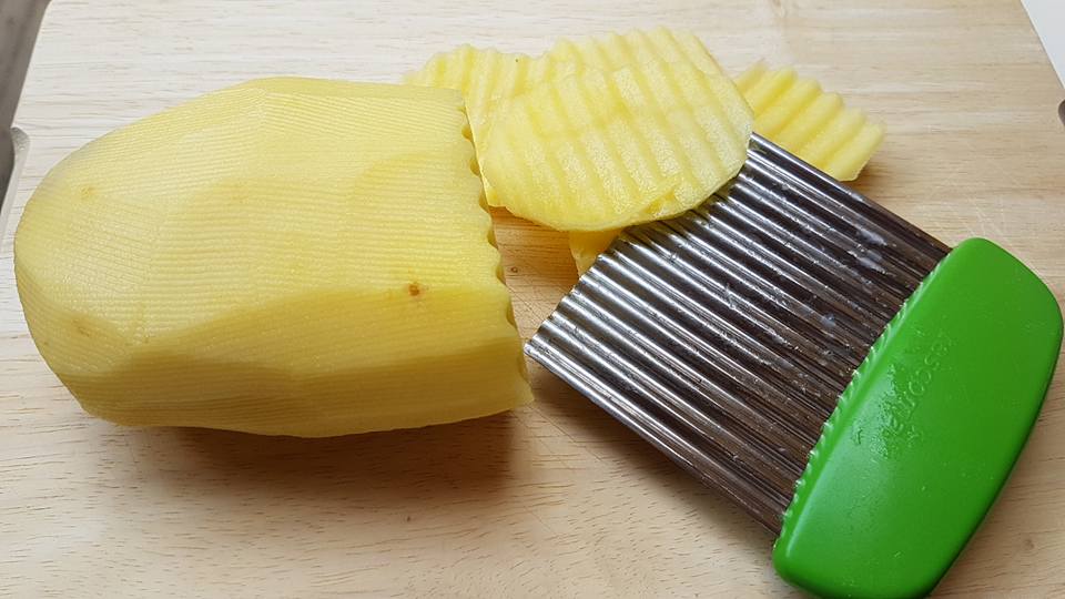 Mentre l’acqua si scalda pelare le patate, quindi affettarle con l’apposito attrezzo che vedete nella foto più in basso per dare la scanalatura… Questo tipo di taglio le rende più croccanti oltre che belle a vedersi.
