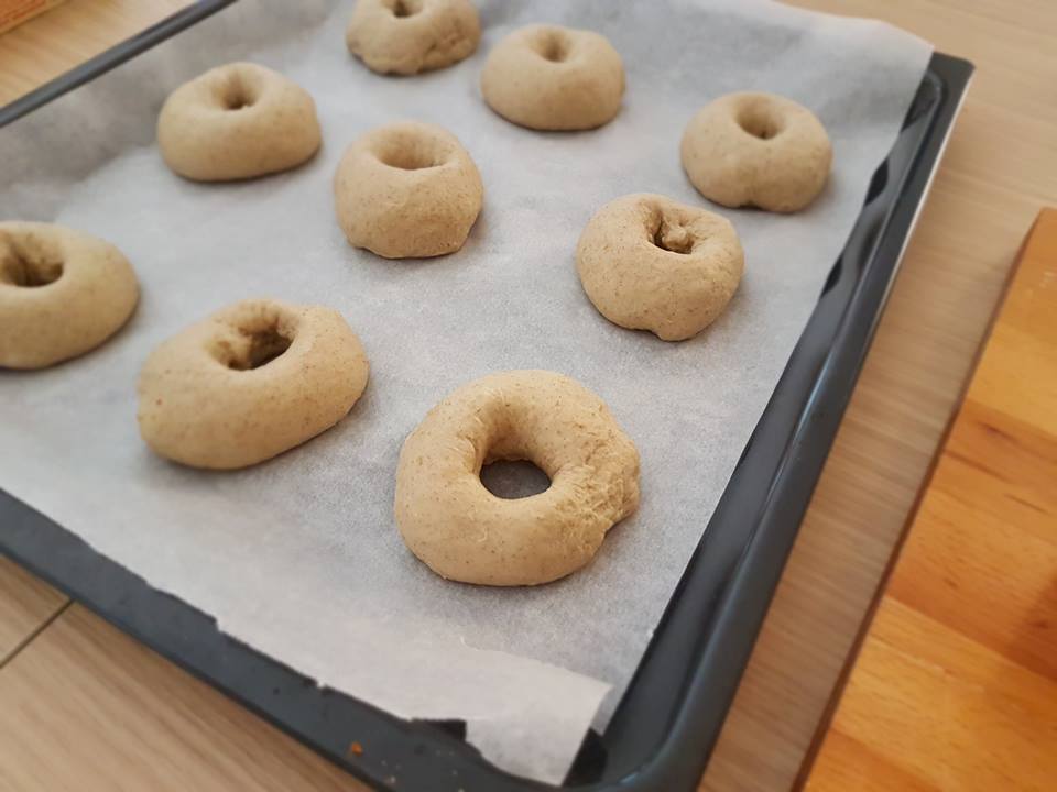 Staccare l’impasto dalla spirale posare in ciotola per un paio di ore, formare tante palline da 100 g, arrotondare e fare un buco al centro come una ciambellina, far rilievitare per circa 60 minuti in teglia su carta forno ben sigillate poi infornare a 190°C forno ventilato.